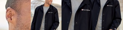 12-ounce, 82/18 cotton/poly fleece Reverse Weave cross-grain cut resists shrinkage 1x1 rib knit neck, side panels, sleeve cuffs and hem Embroidered Champion- C logo at left cuff Woven back neck label