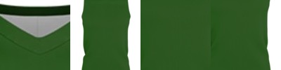 4.8 ounce 50% polyester/50% cotton jersey knit * Contrast color V-neck collar * Set-in sleeves with contrast color sleeve stripes