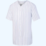 100% polyester smooth pinstripe knit * Wicks moisture * Tag-free label * Full-button jersey * Buttons spaced for easy embellishment * Set-in sleeves * Fishtail bottom
