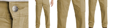 These cargo pants have enough flex that you can easily crouch down to fix a busted taillight. They move with you, not against you. 8.5-ounce, 98/2 cotton/spandex canvas Rugged Flex ® durable stretch technology for ease of movement Sits at the waist Comfortable fit through the seat and thigh with room to move Left-leg cargo pocket with secure cell phone storage Right-leg cargo pocket with utility pocket Stronger sewn-on-seam belt loops Heavy hauling reinforced back pockets Hidden hook and loop closures on cargo and back pocket flaps Straight leg opening fits over boots Carhartt label sewn on right rear pocket Relaxed fit