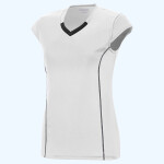 100% polyester wicking smooth knit * Wicks Moisture * Odor resistant * Ladies' fit * Tag-free label * V-neck collar * Contrast color collar and princess seams * Set-in cap sleeves
