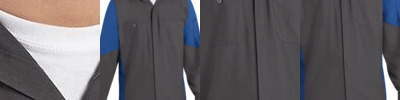 - Two button-thru, hex-style pockets with angled bartacks, bartacked pencil stall on left pocket