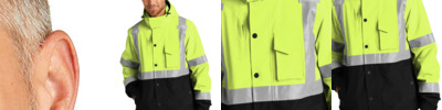 100% polyester 300-denier ripstop shell with durable water-repellent (DWR) finish 4.6-ounce, 100% poly microfleece upper body lining 3-ounce quilted polyfill lower body lining 2-ounce quilted polyfill hood and sleeve lining Black bottom front and lower sleeves for a cleaner appearance Fabric waterproof rating: 5000MM Fully seam-sealed Adjustable rain hood Durable, reflective 2-inch tape meets ANSI 107 requirements Full-length exterior storm flap Left chest pocket Right chest pocket Two lower front pockets Center front zippered pocket to hold a tablet Mic clips at shoulders Elastic cuffs Elastic hem Decoration access pocket This garment must be fully zipped to be in compliance with ANSI 107 standards