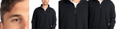 Heavyweight 100% polyester matte brushed tricot * Tag-free label * Quarter zip pullover style * Contrast color inserts * Set-in sleeves * Front pouch pockets * Self-fabric cuffs and bottom band