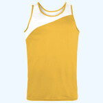 100% polyester wicking knit * Wicks moisture * Tagless label * Asymmetrical contrast color yoke