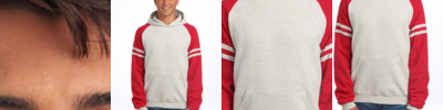 8-ounce, 50/50 cotton/polyester NuBlend ® pill-resistant fleece Made with sustainably sourced USA-grown cotton High stitch density for a smooth printing surface Jersey-lined hood No drawcord in hood Contrast raglan sleeves Athletic-inspired varsity stripes on sleeves Front pouch pocket 1x1 rib knit cuffs and hem Double-needle coverstitching on armholes and hem Tear-away label