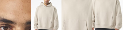 10-ounce, 80/20 combed ring spun cotton/recycled polyester fleece 75/25 cotton/polyester (Heather Gray) 100% cotton face Shoulder to shoulder binding Tear-away label Halfmoon at back neck Hoodie with no drawcords 1x1 rib knit collar Dropped shoulders Front pouch pocket Side seamed 2x2 rib knit cuffs and hem Oversized fit