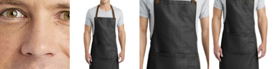 Craftsman styling creates a signature look in this apron that¿s perfect for bistros, pubs, cooking classes and more. The wrinkle-resistant fabric has a denim-like look which blends performance with style to make a sophisticated statement. 7-ounce, 60/40 cotton/poly yarn-dyed twill Adjustable contrast webbing neck strap with antique-finish metal slider Patch pocket, pen pocket Self-fabric waist ties Contrast stitch details Measures: 25'w x 34.5'l
