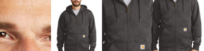 For those days when a heavy jacket is just too much to wear on the job, this durable, water-repellent sweatshirt is the solution. 13-ounce, 75/25 cotton/poly blend or 55/45 cotton/poly blend with Rain Defender durable water-repellent finish (Black, New Navy)* 55/45 cotton/poly blend (Carbon Heather) Attached jersey-lined three-piece hood with drawcord closure Antique-finish brass front zipper Two front hand warmer pockets with hidden security pocket inside Stretchable, spandex-reinforced, rib knit cuffs and waistband Carhartt label sewn on left hand warmer pocket *Please note: Select colors in Carhartt fleece are currently transitioning from a 75/25 cotton/poly blend to a 55/45 cotton/poly blend. Weight and fabric properties remain the same. Your order may contain a combination of both fabrics.
