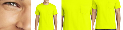 5.3-ounce, 100% US cotton 50/50 cotton/poly (Graphite Heather, Safety Green) 90/10 cotton/poly (Sport Grey) Taped neck and shoulders Recycled, high-performing black tear-away label Non-topstitched, classic width, rib collar Left chest pocket Classic fit, seamless body
