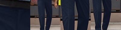 - Slack-style front pockets, two set-in hip pockets, left has button closure, darts over hip pockets for better fit